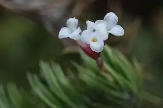 Es una planta perenne con hábito epífita. Los tallos están cubiertos con muchas hojas con entrenudos cortos. La inflorescencia terminal cuenta con brácteas de color rosa y flores blancas.