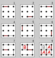 Cuando un jugador forma con estas líneas un cuadrado, se anota este, escribiendo una inicial en el centro o marcándola con un color distintivo. Después de formar un cuadrado deberá dibujar una línea más, cerrando todos los cuadros que el tablero permita. El jugador que se haga con más cuadrados gana la partida.