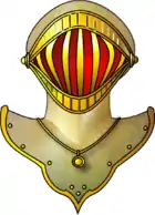 El yelmo simple, es señal distintiva de los Caballeros y los Escuderos que no ostenten una dignidad superior y consta de tres partes: