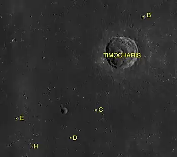 Por convención estos elementos son identificados en los mapas lunares poniendo la letra en el lado del punto medio del cráter que está más cercano a Timocharis.