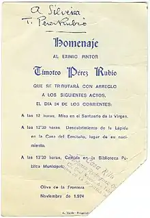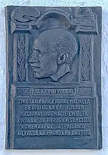 ![]() Oliva de la Frontera (Badajoz). Placa conmemorativa del lugar de nacimiento de Timoteo Pérez Rubio en la fachada de la denominada "casa del ermitaño", situada a escasos metros del santuario de Nuestra Señora de Gracia, patrona de la localidad, descubierta el 24 de noviembre de 1974. | ||