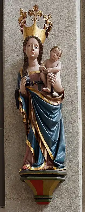La estatua, tallada en madera de roble, mide 180 centímetros de altura[1] y muestra a la Virgen vestida con un suntuoso traje azul con cenefa dorada, recogido sobre su hombro derecho, luciendo bajo el mismo un vestido blanco. En su cabeza destaca una gran corona dorada ornamentada con cinco flores de lis, símbolo de la Trinidad.[2] La Madona sostiene en su brazo izquierdo al Niño Jesús, quien, desnudo, se aparta de su madre mediante una leve inclinación.