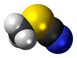 El tiocianato de metilo es un compuesto orgánico con la fórmula CH 3 SCN. El miembro más simple de los tiocianatos orgánicos, es un líquido incoloro con olor a cebolla. Se produce por la metilación de las sales de tiocianato. El compuesto es un precursor del isómero más útil isotiocianato de metilo (CH 3 NCS).[4]