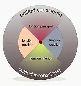 De las cuatro existe el predominio de una por predisposición natural, definida como función principal o superior, mientras las restantes quedan a nivel inconsciente. Dos de ellas, denominadas funciones auxiliares, resultan relativamente diferenciadas, mientras que la cuarta, la función de menor valor o inferior, se caracterizaría por quedar totalmente inconsciente, pudiéndose diferenciar solo relativamente, y constituyéndose como la función opuesta a la principal. Dicho antagonismo incluiría su correspondiente compensación.