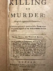El folleto de Edward Sexby de 1657, "Killing, No Murder"[13] describía 14 rasgos clave de un tirano, ya que el texto fue escrito para inspirar el asesinato de Oliver Cromwell, y mostrar en qué circunstancias un asesinato podría considerarse honorable. El documento completo reflexiona y hace referencia a puntos sobre el tema desde la historia precristiana temprana, hasta el siglo XVII, cuando se redactó el texto. De los rasgos más predominantes de la tiranía descritos, "Killing, No Murder" enfatiza: