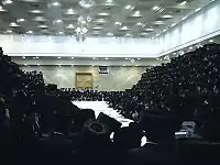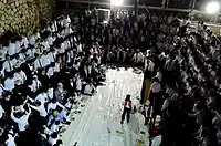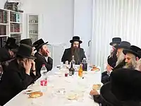 Jasidim de Belz celebrando un Tish jasídico durante la festividad de Purim.