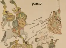 ![]() Guerreros tlaxcaltecas luchando contra guerreros de Texcoco, Cuauhtepec y Ocelotepec. | ||