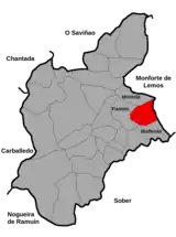 Limita con las parroquias de Moreda al norte, Mañente al sur, Pantón al oeste y Vid al este, esta última perteneciente al municipio de Monforte de Lemos.