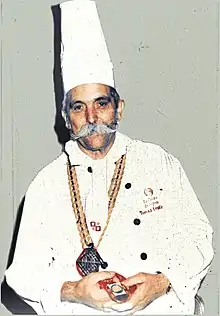 Tomás Urrialde, con su atuendo típico de cocinero, con el Cordón de San Lorenzo y la Medalla de FACYRE, año 1989.