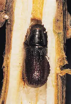 La hembra deposita alrededor de 70 huevos en una galería que perfora en la corteza. Los huevos tienen 0.5 mm de diámetro y están separados uno de otro por un espacio de 1 mm.