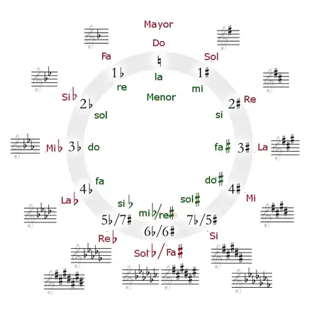 Figura 7. Círculo de quintas mostrando las tonalidades mayores y menores con sus armaduras.