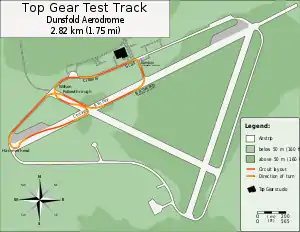 El circuito de pruebas Top Gear, es el propio del programa, en donde prueban los distintos autos que salen al mercado, así como también clásicos de época. Cuentan con una columna en la que guardan el mejor tiempo que The Stig pudo realizar con cada uno. Por otro lado, también lo utilizan para que los famosos invitados hagan vueltas en un coche de precio razonable, y luego colocar su mejor tiempo en otra columna con los tiempos de todos los famosos que fueron invitados al Show. Y finalmente es usado para hacer tests con los coches que después hacen el tiempo en la pista. El circuito cuenta con ocho curvas, que son las siguientes: