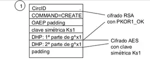 Sobre el formato de la célula CREATE cabe señalar que el cifrado de g^x se hace de forma híbrida (con RSA-OAEP se cifra una clave de sesión y parte de g^x, con la clave de sesión se cifra el resto de g^x) para permitir que en una sola célula podamos hacer el intercambio del g^x completo.
