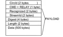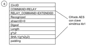 Observar que consiste en la comunicación de la respuesta al protocolo Diffie-Hellman que hace el OR2 al OP usando al OR1 como intermediario sin que este pueda inferir información alguna. El campo streamID vale 0 porque este tipo de células relay sirven para control.