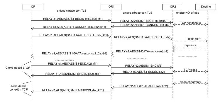 - A continuación el OP envía una petición al OR1 para extender el circuito mediante una célula RELAY_EXTEND. Esta célula le indica al OR1 cual va a se el nuevo nodo OR2, su puerto y también contiene estructuras de datos que le tendrá que reenviar el OR1 al OR2 y que permitirán establecer un protocolo D-H de intercambio de claves entre el OP y OR2 a través de OR1 sin que el OR1 se entere de nada