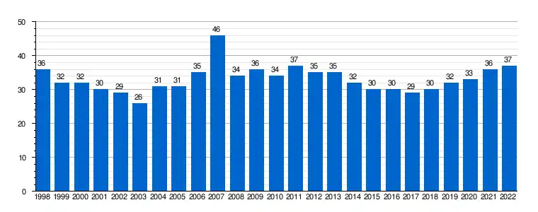 | Gráfica de evolución demográfica de Toril y Masegoso[6] entre 1998 y 2022 |