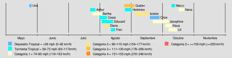 ![]() Mapa resumen de la temporada, que trazan las trayectorias y la intensidad de las tormentas, de acuerdo con la escala de huracanes de Saffir-Simpson (EHSS) | ||