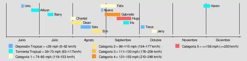 Iris 16-27 de septiembre Tormenta tropical 115 km/h (71 mph) 1001 N/A Ninguno 0 0