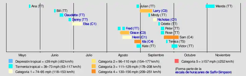 La temporada de huracanes en el Atlántico de 2021 fue la tercera temporada de huracanes del Atlántico más activa registrada, produciendo veintiún tormentas nombradas; también fue la segunda temporada consecutiva después de 2020, y la tercera en general, en la que se agotó la lista designada de veintiún nombres de tormentas.[1][2] También fue el sexto año consecutivo en el que hubo actividad de ciclones tropicales por encima del promedio desde 2016.[nb 1][1] Además, con un daño total de más de $80 mil millones,[nb 2] fue la cuarta temporada más costosa registrada después de 2022, 2005 y 2017.[4] Ocho tormentas con nombre azotaron a los Estados Unidos que es la tercera mayor cantidad de la historia, solo por detrás de la temporada de 2020 con 11 y de 1916 con 9. Entre esta temporada y la de 2020, 19 sistemas tropicales con nombre tocaron tierra en el país conjuntamente, superando el récord anterior de 15 establecido durante las temporadas de 2004 y 2005 juntas. La temporada comenzó el 1 de junio y finalizó el 30 de noviembre. Estas fechas, adoptadas por convención, describen históricamente el período de cada año en el que se forman la mayoría de los ciclones tropicales del Atlántico. Sin embargo, la ciclogénesis tropical o subtropical es posible en cualquier época del año, como fue el caso de esta temporada, cuando la tormenta tropical Ana se formó el 22 de mayo, siendo el séptimo y último año consecutivo en que se formó una tormenta antes del inicio designado de la temporada.[5]