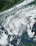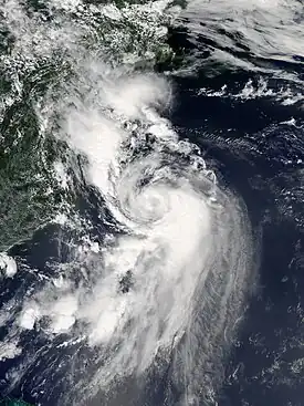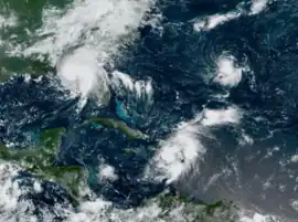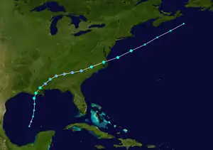 El 11 de junio, el Centro Nacional de Huracanes (NHC) en Miami comenzó a monitorear un potencial bajo tropical en el Golfo de México.[56] Inicialmente, el sistema se movió lentamente hacia el sur y provocó fuertes lluvias en el sur de México y América Central.[57] Luego deambuló con una circulación vagamente definida en la Bahía de Campeche durante unos días. Luego, el sistema comenzó a moverse hacia el norte y desarrolló una circulación muy amplia.[58] El 17 de junio a las 18:00 UTC, el NHC comenzó a emitir avisos sobre el sistema como Potencial Ciclón Tropical Tres ubicado en ese momento en el Golfo de México.[59] Los datos satelitales indicaron vientos con fuerza de tormenta tropical el 18 de junio a las 18:00 UTC, pero la tormenta aún carecía de una circulación de bajo nivel bien desarrollada.[60] A medida que el sistema se movía hacia el sur de Luisiana a fines del 18 de junio, las imágenes de satélite finalmente revelaron una circulación superficial suficientemente bien definida y a las 00:00 UTC del 19 de junio, el NHC clasificó el sistema a tormenta tropical, asignándole el nombre de Claudette a 80 millas (130 km) al sur de Morgan City, Luisiana.[61] Poco después de su formación como tormenta tropical, Claudette tocó tierra en Terrebonne Parish, Luisiana a las 04:30 UTC de ese día, en su máxima intensidad, con vientos de 75 km/h (45 mph) y una presión mínima de 1003 mbar. Claudette luego se debilitó en una depresión tropical a medida que avanzaba hacia el interior a las 18:00 UTC de ese día y produjo vientos racheados en áreas de Misisipi, Alabama, Georgia y partes de Florida.[62] El 21 de junio a las 06:00 UTC, Claudette se volvió a fortalecer en una tormenta tropical con su centro ubicado sobre Carolina del Norte.[63][64] Después de entrar en el Océano Atlántico a las 15:00 UTC,[65] Claudette se alejó de la costa de Estados Unidos,[66] antes de degenerar en un canal de baja presión a las 06:00 UTC del 22 de junio.[67]