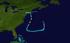 Un área no tropical de baja presión se formó a unas 150 millas (240 km) al sur de Wilmington, Carolina del Norte, el 13 de junio y comenzó a monitorearse para detectar un posible desarrollo tropical, aunque las posibilidades de que ocurriera inicialmente se consideraron bajas.[46] Sin embargo, de la noche a la mañana, el sistema se organizó rápidamente con una convección amplia y profunda y una pequeña formación de núcleo.[47] A las 06:00 UTC del 14 de junio, el sistema se convirtió en la Depresión Tropical Dos a 110 millas (117 km) al este-sureste de Cape Fear, Carolina del Norte.[48] La depresión se aceleró hacia el noreste en las horas siguientes, y la convección disminuyó brevemente como resultado de la cizalladura del viento y la circulación quedó expuesta, como se ve en las imágenes de satélite visibles.[49] Doce horas más tarde, a las 18:00 UTC de ese día, la depresión se fortaleció en la tormenta tropical Bill cuando la tormenta desarrolló un grupo más definido de tormentas al noreste del centro, mientras que un pase de dispersómetro confirmó además que el ciclón estaba produciendo vientos huracanados y estaba localizada en ese momento a 135 millas (217 km) al este de Cabo Hatteras, Carolina del Norte.[50] Bill se intensificó el 15 de junio y la convección se organizó en un patrón de banda curva a pesar de la cizalladura del viento.[51] La tormenta alcanzó su intensidad máxima a las 12:00 UTC de ese día, con vientos máximos sostenidos de 100 km/h (65 mph) y una presión mínima de 992 mbar.[52] A pesar de que se estaba desarrollando una estructura de núcleo apretado, el aire seco comenzó a envolver la sección sureste de la tormenta poco después de ese momento.[53] La fuerte cizalladura del viento expuso y alargó el centro de Bill hacia el suroeste de la convección mientras corría hacia el noreste a más de 35 mph (56 km/h).[54] Cerca de las 00:00 UTC del 16 de junio, Bill hizo la transición a un ciclón extratropical a 320 millas (515 km) al este-sureste de Halifax, Nueva Escocia.[55]