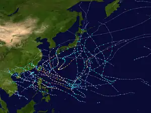 ![]() Mapa resumen de la temporada, que trazan las trayectorias y la intensidad de las tormentas, de acuerdo con la escala de huracanes de Saffir-Simpson (EHSS) | ||