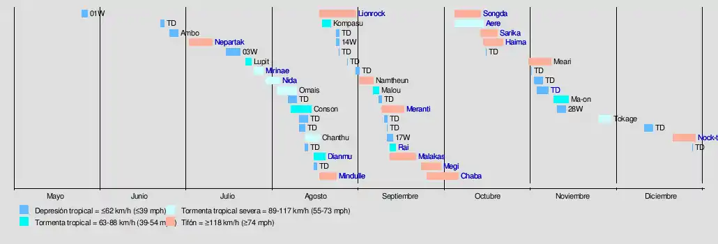 En septiembre, el tifón Meranti se convirtió en el tifón más fuerte en términos de presión desde el tifón Megi en 2010, así como en el tifón más fuerte en términos de vientos sostenidos desde el tifón Haiyan en 2013, y el segundo ciclón tropical más fuerte del mundo en 2016, solo detrás del ciclón. Winston, en términos de presión. El tifón Megi alcanzó su máxima intensidad como tifón de categoría 3 al tocar tierra sobre Taiwán. Tanto Meranti como Megi tocaron tierra en Fujian, China, y causaron daños por un total de 3.600 millones de dólares. Rai se convirtió en una tormenta tropical débil antes de tocar tierra en Vietnam, Laos y Tailandia a mediados de septiembre, causando inundaciones y daños moderados. El tifón Malakas afectó a Japón con un total de casi $740 millones en daños como un tifón de categoría 4.[nb 4] A finales de septiembre y principios de octubre, el tifón Chaba alcanzó la intensidad de supertifón de categoría 5 y se convirtió en el ciclón tropical más fuerte que tocó tierra en Corea del Sur desde Sanba en 2012. Chaba también causó 7 muertes en el país.[14] Una depresión tropical se formó al este de la línea internacional de fecha el 3 de octubre y entró en la cuenca antes de convertirse en el tifón Songda. Songda golpeó la región del noroeste del Pacífico de los Estados Unidos y Canadá como un poderoso ciclón extratropical.[15] La severa tormenta tropical Aere afectó partes del sudeste asiático a mediados de octubre, incluida la peor inundación en Vietnam desde 2010, causando daños por un total de 209 millones de dólares.[16][17] Más tarde, el tifón Sarika se convirtió en un poderoso tifón y afectó a Filipinas, China y Vietnam, causando graves daños e inundaciones en el sur de China.[nb 5] Después de Sarika, el tifón Haima alcanzó la fuerza de un súper tifón de categoría 5 antes de afectar a Filipinas y China, causando un total de 1,93 mil millones de dólares en daños. Haima fue el ciclón tropical más severo que afectó a Hong Kong en octubre desde 1995. A principios de noviembre, una depresión tropical tocó tierra en el sur de Vietnam y provocó fuertes inundaciones en todo el centro y sur de Vietnam, causando daños moderados. A fines de diciembre, Nock-ten se convirtió en el ciclón tropical navideño más fuerte registrado en cualquier parte del mundo desde al menos 1960 en términos de vientos sostenidos de 1 minuto, antes de impactar a Filipinas.[19][20]