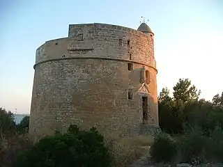 Por su parte, el archiduque Luis Salvador de Austria-Toscana en su obra "Die Balearen" pág. 107 relata lo siguiente: "Tiene doce varas de diámetro y un parapeto a barbilla de dos pies de grosor. Adornan su frontón unos escudos de estilo renacimiento y un blasón con un castillo y un árbol. Sostienen el matacán ménsulas con volutas. Pasado el portal se encuentra un vestíbulo oscuro y una escalera de caracol. En el piso hay una serie de puertas de arco apuntado, que corresponden a otros tantos alojamientos. Dos gradas de piedra arenisca permiten pasar el matacán. El piso de la terraza superior está enlosado con losas de piedra arenisca dispuestas concéntricamente. Al pie de la escalera hay un pórtico con bóveda de cañón, bajo el cual está la cocina y la cisterna. La torre tiene un segundo matacán destruido que avanza sobre el camino".