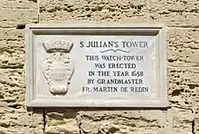 En 1951, el Gobierno de Malta colocó una placa de mármol en la torre con el escudo de armas del Gran Maestre Martín de Redín que la construyó.[5]