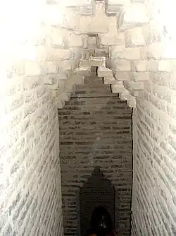 Consta de un recinto exterior, la torre propiamente dicha, y otro interior o contratorre, ambas de planta octogonal. Entre ambas discurre la escalera, cubierta por bóvedas baídas, enlucidas, y escalonadas, a diferencia de los muros, que son de ladrillo cogido con yeso y agramilado horizontal. Se accede a la escalera, desde el nivel del suelo, a través de un monumental arco ojival de piedra. El interior de la contratorre está hueco en su totalidad. La torre, ciega hasta el primer cuerpo de campanas, se ilumina con aspilleras, que alcanzan la escalera mediante pasillos cubiertos con bóvedas enjarjadas, también llamadas de aproximación de hiladas.[2]