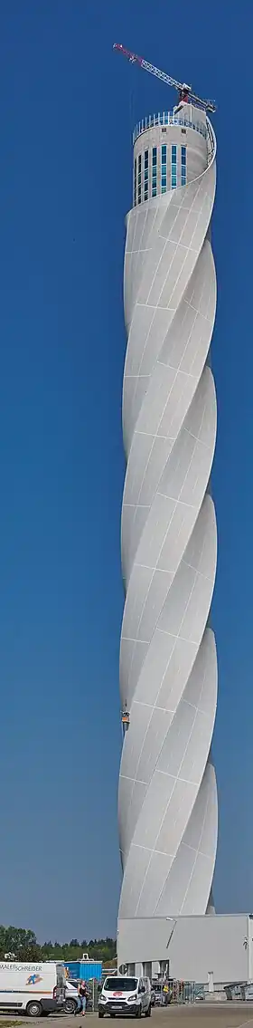 La torre ha ganado numerosos premios de arquitectura, ingeniería y diseño y ofrece algunos puntos de venta únicos. Es la primera estructura en el mundo que se puede hacer vibrar mediante un péndulo de vibración dentro del eje de la torre. Las cargas de viento reales se simulan de esta manera. El eje está cubierto con un tejido especial de fibra de vidrio a lo largo de un tubo helicoidal, que define la forma exterior real de la torre. Esto significa que la torre es también el edificio revestido de textiles más alto del mundo.