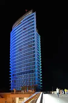 - La torre propiamente dicha se eleva desde el zócalo hasta los 76 metros de altura. Tiene una forma en planta semejante a una gota de agua a punto de pico. Este volumen permite tener una doble percepción del edificio, gracias a la transformación que experimenta de su visión diurna, un volumen opaco, a la nocturna, un gran faro luminoso.
