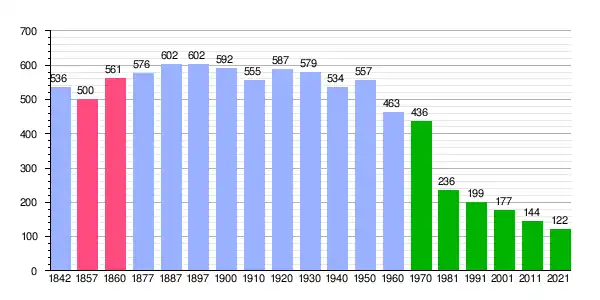 | Gráfica de evolución demográfica de Torrecilla del Rebollar[4][5] entre 1842 y 2021 |