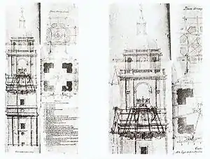 El arquitecto estudió los desperfectos de la torre y buscó un remedio que duró hasta 1841, en que finalmente se derrumbó parte de la estructura. Las obras consistieron en enzunchar[3] la torre con cuatro cadenas de hierro colocadas a diferentes alturas: la primera sobre el entablamento con el que termina el cuerpo bajo, la segunda en el friso del entablamento que coronaba el segundo cuerpo, la tercera en el friso del entablamento con el que se coronaba el tercer cuerpo y la cuarta, en la parte alta del cuerpo ochavado. Se encargó de fabricar las cadenas en Elorrio el maestro Rafael de Amezua. El maestro cerrajero de Valladolid Francisco Ruiz fue el encargado de colocarlas. Para su colocación, Ventura Rodríguez discurrió el realizar un andamio volante que se descolgaba por medio de unas cuerdas enrolladas a un cabrestante situado en el recinto definido por los cuatro grandes arcos del tercer cuerpo de la torre. Para colocar los dos zunchos[4] más altos, el cabrestante se desmontaría y se colocaría esta vez en la sala de campanas, en el interior del cuerpo ochavado. Todo esto se refleja en el extraordinario plano que levantó el arquitecto de la torre de la catedral. El andamiaje, que permitió colocar los cuatro zunchos de una manera muy económica, fue muy admirado en su época.
