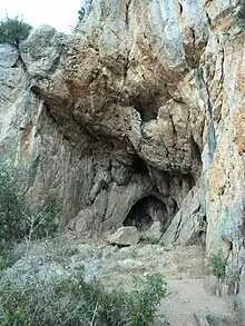 Imagen área del Castillo del Montgrí - Cau del Duc: cueva natural de origen kárstico y yacimiento paleolítico, donde se han econtrado evidencias de ocupación por poblaciones prehistóricas. Existen otras cuevas a lo largo del macizo, pero su acceso es difícil y, en ocasiones, está cerrado.