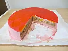 ![]() Torta helada de gelatina de fresa y limón batido con leche, rellena de melocotón y almíbar. | ||
