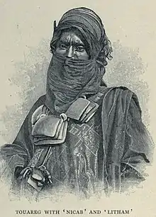 Los tuaregs,[8] imuhar o kel tamasheq son un pueblo bereber (o amazigh) de tradición nómada del desierto del Sáhara. Su población se extiende por seis países africanos: Argelia, Libia, Níger, Malí, Mauritania y Burkina Faso. Cuando se desplazan, cubren tanto sus necesidades como las de sus animales, debido a que viven en unidades familiares extensas que llevan grandes rebaños a su cargo. Tienen su propia escritura, el tifinagh, y su propio idioma, el idioma tamashek.