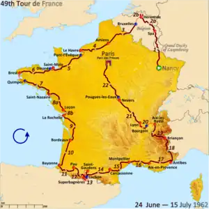 El 49.º Tour de Francia[1] se disputó entre el 24 de junio y el 15 de julio de 1962 con un recorrido de 4274 km. dividido en 22 etapas de las que la segunda y la octava estuvieron divididas en dos sectores.