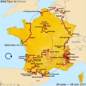 El 63.º Tour de Francia se disputó entre el 24 de junio y el 18 de julio de 1976 con un recorrido de 4017 km. dividido en un prólogo y 22 etapas, de las que la quinta y la vigésima segunda estuvieron divididas en dos sectores y la decimoctava constó de tres sectores. Participaron 13 equipos de 10 corredores, de los que solo uno logró finalizar la prueba con todos sus integrantes. El vencedor cubrió la prueba a una velocidad media de 34,518 km/h.