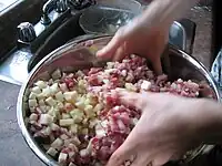 El pastel posee dos ingredientes básicos una masa de pan que se recubre en una olla y carne picada en pequeños cubos de medio centímetro que puede ser de diferentes animales (cerdo y vaca al 50% es la combinación más popular), algo de tocino y en algunos lugares ponen dados de patata e incluso cebolla y apio picados. Junto con la carne picada, se incluye algo de caldo de carne para que no quede tan seco al final. Se cierra con la masa y se mete en el horno por unas horas a 250 °C.[3][2] Hay algunos cocineros que preparan la carne en una sartén junto con todos los ingredientes (de esta forma reducen el tiempo de cocción en el horno), otros por el contrario mezclan todo crudo y se va haciendo todo en el horno.