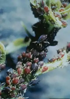 ![]() Colonia de Toxoptera citricida sobre un ejemplar de naranjo (Florida Division of Plant Industry Archive) | ||