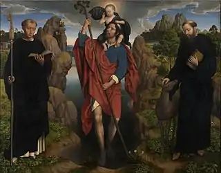 La figura central es San Cristóbal, patrón de los viajeros, quién comparte su fiesta, el 25 de julio, con San Jaime o Santiago, a quien la iglesia estaba dedicada. Es mostrado cruzando un arroyo con el Niño Jesús en sus hombros. Es presentado con sus atributos tradicionales incluyendo un largo báculo florido, símbolo de la presencia milagrosa de Cristo, y se le creía protector contra la muerte repentina.[10] Cristóbal está vestido con una túnica corta azul, y cubierto con una larga capa roja arrollada sobre su hombro derecho. Se parece mucho a representaciones anteriores del mismo santo por Jan van Eyck, una en el Políptico de Gante y otra un San Cristóbal ahora perdido, en el que Memling se inspiró fuertemente para esta figura.[11]