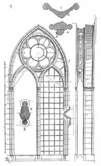 La sección transversal de cada montante o barra de tracería era importante tanto para la integridad estructural de la ventana como para el efecto visual. Como se puede ver en el diagrama de Viollet-le-Duc (derecha), normalmente había una moldura en rollo tanto en el interior como en el exterior de las ventanas, lo que hacía que los parteluces parecieran aún más delgados de lo que realmente eran. El hombro marcado con una 'B' en el diagrama es la ranura del acristalamiento, en la que se monta el marco de metal ( armadura ) del vidrio de la ventana. A diferencia de la tracería de placas, donde cada piedra tenía que tener una forma individual, los elementos de la tracería de barras se podían producir en masa según plantillas estándar en el patio del albañil, trabajo que podía continuar incluso cuando hacía demasiado frío para que fraguase el mortero de cal . Los aspectos técnicos de las ventanas de Reims claramente fascinaron a Villard de Honnecourt, quien visitó el sitio de construcción, probablemente en la década de 1220, e hizo un boceto detallado de las diversas plantillas, utilizando una clave para mostrar cómo encajaban en las diferentes partes de la ventana. (las plantillas están en la mitad inferior del anverso del folio 32; los símbolos además de las plantillas coinciden con otros similares en el dibujo detallado de las elevaciones de Reims en la página opuesta, verso del folio 31).