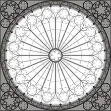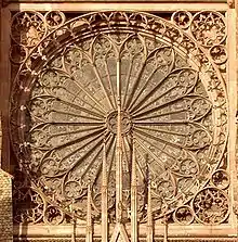 La tracería geométrica se identifica por las aberturas circulares en la cabecera del arco de la ventana. Más tarde se hizo común las tres aberturas debajo de dos círculos y una tercera en la punta del arco;[6] se puede ver un ejemplo de este tipo a lo largo del pasillo de la Catedral de Lincoln. También en la Catedral de Lincoln, la ventana este es una versión ampliada de esta idea con dos arcos interiores, un total de ocho aberturas inferiores, cuatro circulares pequeñas rematadas con dos círculos más grandes para llenar los arcos interiores, y finalmente sobre todo una gran forma circular llena de siete luces circulares más pequeñas. La tracería geométrica, en sus primeras etapas, tenía una regla de ley equilátera, donde el diseño de la tracería sigue la forma del arco de manera equilátera. Se pueden implementar elementos decorativos adicionales, como la foliación o el " triángulo esférico ". El uso de triángulos esféricos es una adaptación posterior y probablemente refleja un significado religioso.[7] Esos cabios dieron lugar al gótico radiante, el estilo que produjo los grandes rosetones de Francia. Estas ventanas cubren no solo los frentes occidentales de las iglesias, sino también, a menudo, como en Notre-Dame de París, los frontones del transepto. Es común que aunque los transeptos de las iglesias francesas no sobresalgan fuertemente, se les dé una importancia visual casi igual a la del frente oeste, incluyendo grandes portales decorados y un rosetón. Ejemplos particularmente buenos se encuentran en Notre-Dame y la Catedral de Chartres.