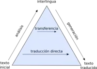 En la traducción por transferencia, el análisis del original juega un papel más importante, y da paso a una representación interna que es la que se utiliza como enlace para traducir entre idiomas distintos.