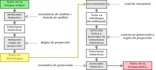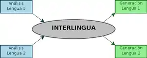 La traducción utilizando una lengua intermedia es un sistema que abarca el análisis de las oraciones de un texto escrito en una lengua fuente para imponer en ellas las características morfológicas, sintácticas y semánticas correspondientes a la lengua objetivo/destino, realizando una primera transferencia del texto analizado a una lengua intermedia/puente. Dicha lengua posee todas las características morfológicas, sintácticas y semánticas de los idiomas que serán traducidos, en lugar de traducir directamente de la lengua fuente a la objetivo.