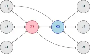 La indudable ventaja de esta estrategia es que ofrece solidez y, sobre todo, economía en la traducción en sistemas multilingües. Así, mediante el método tradicional de traducción directa necesitamos un par de módulos traductores para cada pareja de lenguas (en total N*(N-1) módulos, como se puede apreciar en la Figura 2); mientras que para la traducción mediante lengua intermedia tan solo necesitamos 2*N módulos, ya que cada lenguaje sólo se relaciona con la lengua intermedia.
