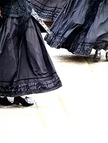 - Mantelo o muradana. Se coloca por debajo del mandil siendo mucho más grande que éste y cubriendo casi por completo la falda. Es normal decorarla con terciopelo y dibujos de pedrería.
