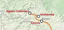 - Urubamba - Machu Picchu. El servicio parte de la estación Urubamba, en la ciudad homónima hasta la Estación Aguas Calientes en el distrito de Machu Picchu, provincia de Urubamba. Este ramal se une al ramal principal en la localidad de Pachar en el distrito de Ollantaytambo, provincia de Urubamba.