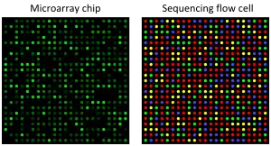 Los primeros pasos del ARN-Seq también incluyen un procesado similar de imágenes; sin embargo, la conversión de imágenes a datos de secuencias se trata típicamente de manera automática mediante software. El método de secuenciación por síntesis de Illumina resulta en un array de clústeres distribuidos sobre la superficie de una celda de flujo.[102] La celda de flujo se visualiza hasta cuatro veces durante cada ciclo de secuenciación, con un total de decenas a cientos de ciclos. Los clústers de celdas de flujo son análogos a los puntos de un microarray y se deben identificar correctamente durante los primeros estadios del proceso de secuenciación. En el método de pirosecuenciación de Roche, la intensidad de luz emitida determina el número de nucleótidos consecutivos en una repetición homopolimérica. Existen muchas variantes de estos métodos, cada cual con un perfil de error diferente para los datos resultantes.[103]